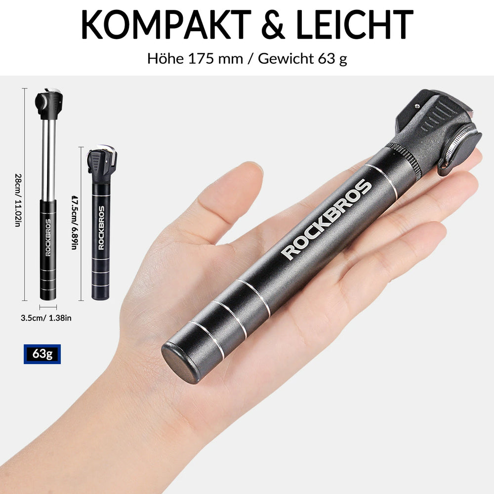 Die Mini-Fahrradpumpe mit hochwertiger Alu-Gehäuse weist eine gute Haltbarkeit und Korrosionsbeständigkeit auf. Darüber hinaus gibt es eine Staubschutzhülle, die die Pumpe wirksam vor Regen und Staub schützen kann.