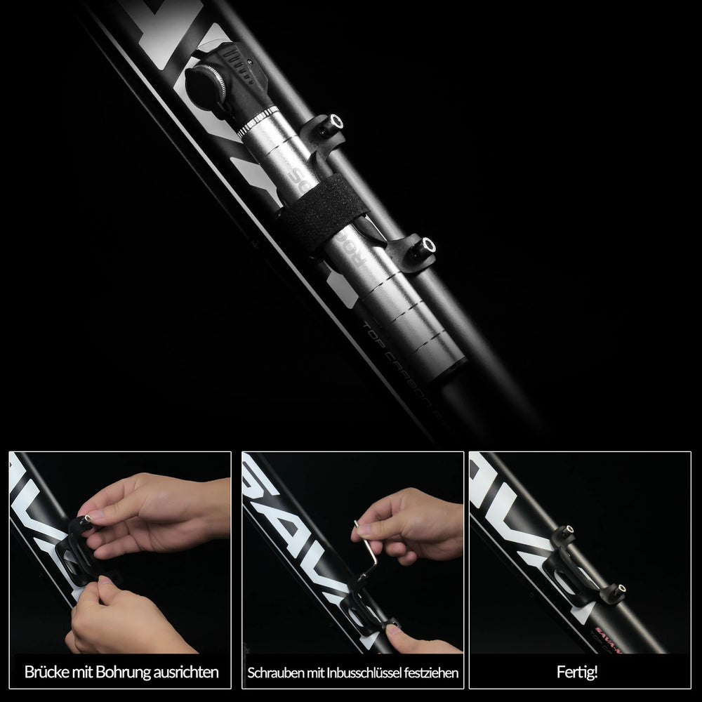 Mit der mitgelieferten Rahmenhalterung, 2 Schrauben und Klettbändern können Sie die Pumpe einfach unter der Wasserflaschenhalterung aufbewahren.