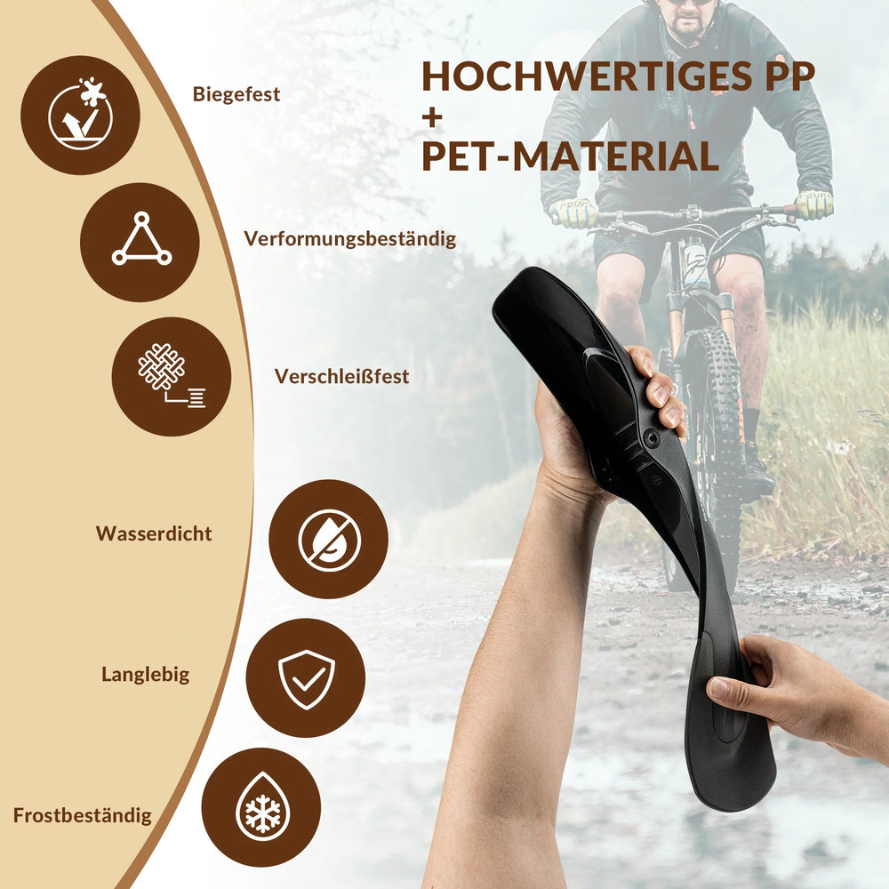 Flexibel & Langlebig: Die Schutzbleche bestehen aus robustem und bruchsicherem PP-Material, das flexibel genug ist, um Stöße und Vibrationen zu absorbieren, ohne sich zu verformen. Die Enden sind mit weichem PET-Gummi umwickelt, was sie widerstandsfähig gegen Stürze, Abrieb und Kälte macht.