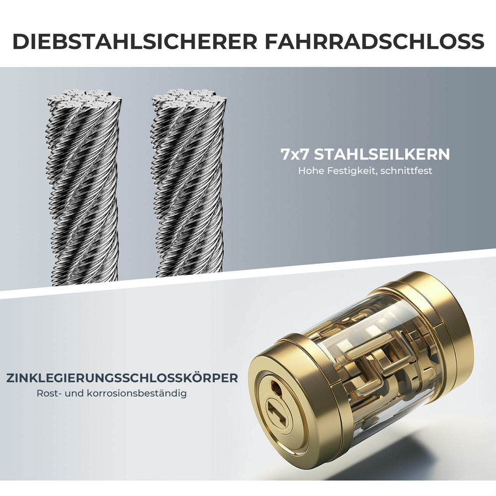 Verstärkter Schlosskern aus Zinklegierung, widerstandsfähig gegen Aufhebeln und Aufpicken. Korrosionsbeständig und langlebig, ideal für Fahrrad, E-Bike und Scooter