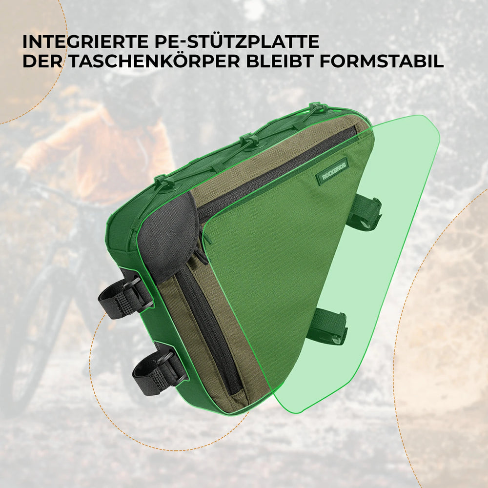 - Schlankes Design mit schmalem Rand: Diese Fahrradrahmentasche hat eine dreieckige Form und wird stabil im Fahrradrahmen montiert. Das stromlinienförmige Design mit schmalem Rand reduziert den Kontakt mit den Beinen und sorgt für Komfort bei gleichzeitigem Geschwindigkeitsvorteil