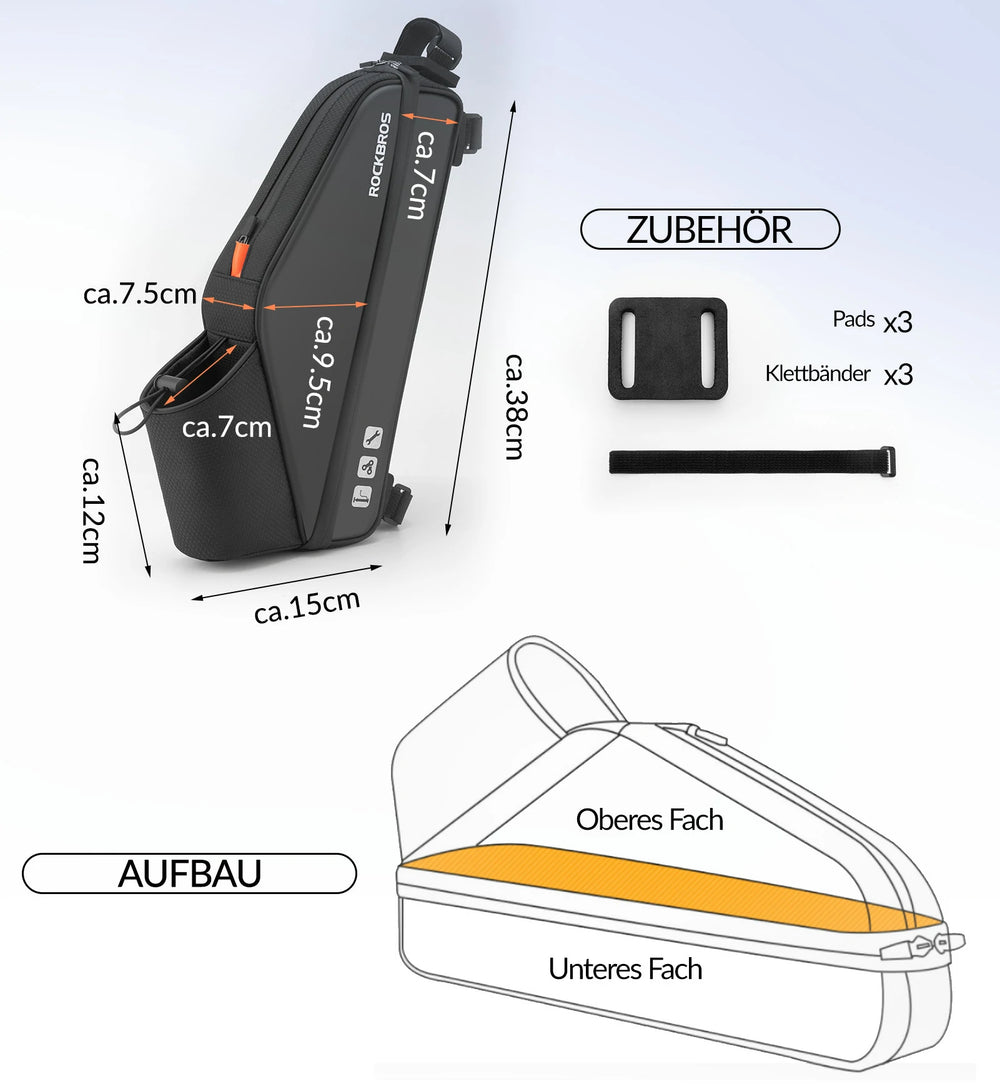 Insgesamt 3L Große Kapazität. Die obere Schicht 2L und die untere Schicht 1L. Die Länge der Tasche beträgt ca. 38cm, damit können Pumpen, Wartungswerkzeuge, Fahrradschlösser, Handschuhe, Handy usw. aufbewahrt werden.