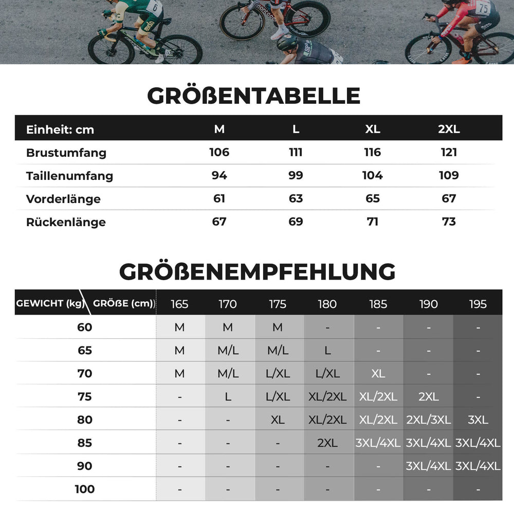 Umfangreiche Größentabelle und Größengrafik (Brustumfang, Taillenumfang, Vorder-/Rückenlänge) helfen bei der Auswahl der idealen Größe für verschiedene Körperformen (M bis 2XL).