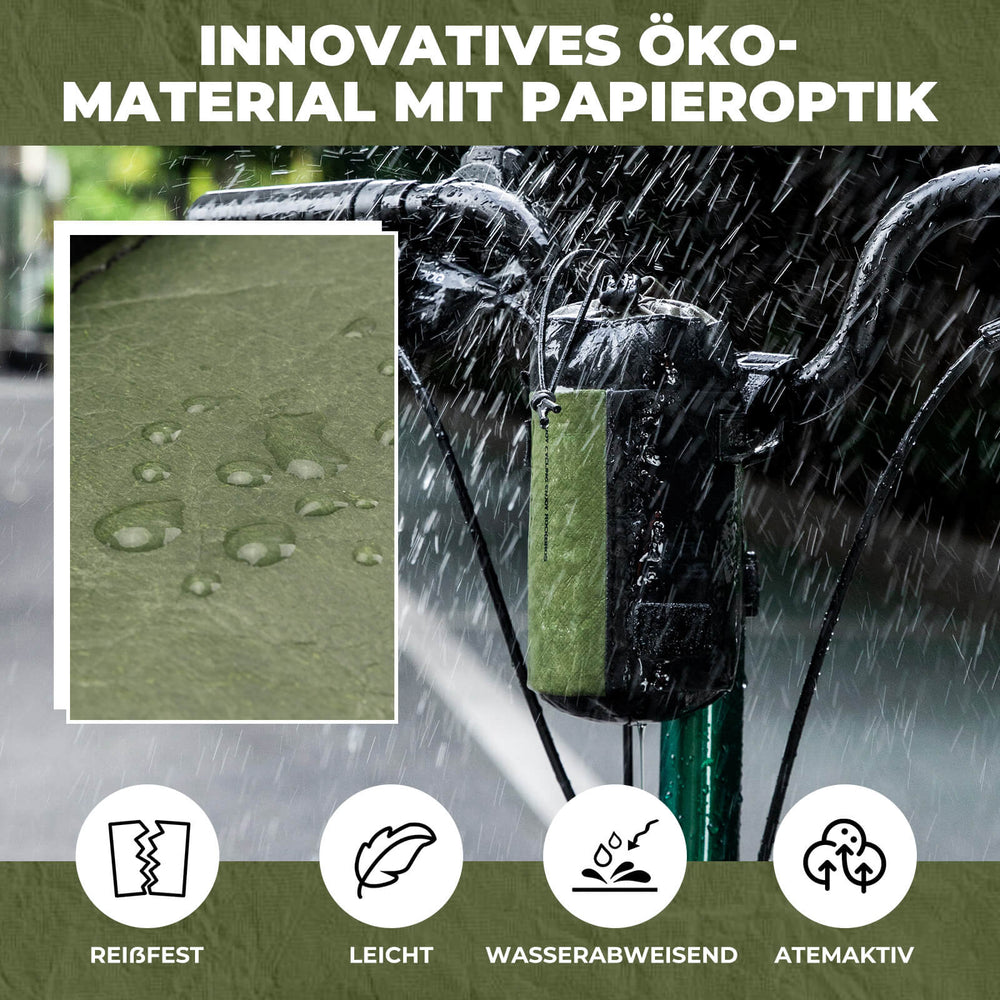 Hergestellt aus einem besonders leichten, reißfesten und wasserabweisenden Funktionsmaterial mit moderner, papierähnlicher Oberfläche. Das Material verbindet stilvolles Design mit hoher Funktionalität und ist somit die ideale Wahl für umweltbewusste Radfahrer:innen, die Wert auf Nachhaltigkeit und Performance legen.