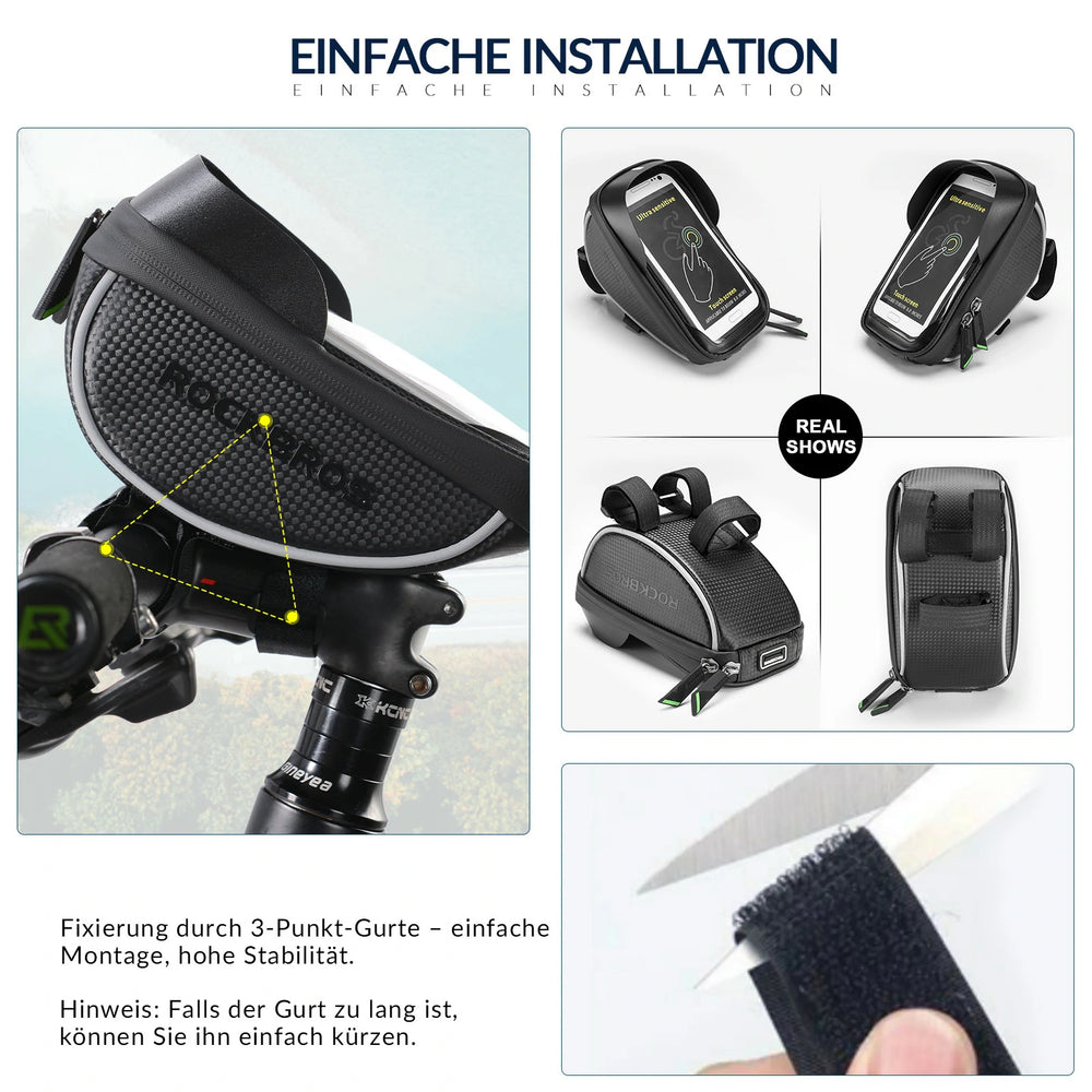 Der Halter kann sich ohne Werkzeug installiert werden. Die Halterung und die Lenkertasche ist mit einer Schnalle verbindet. Wodurch kann man die Tasche aus der Halterung einfach und schnell abnehmen.