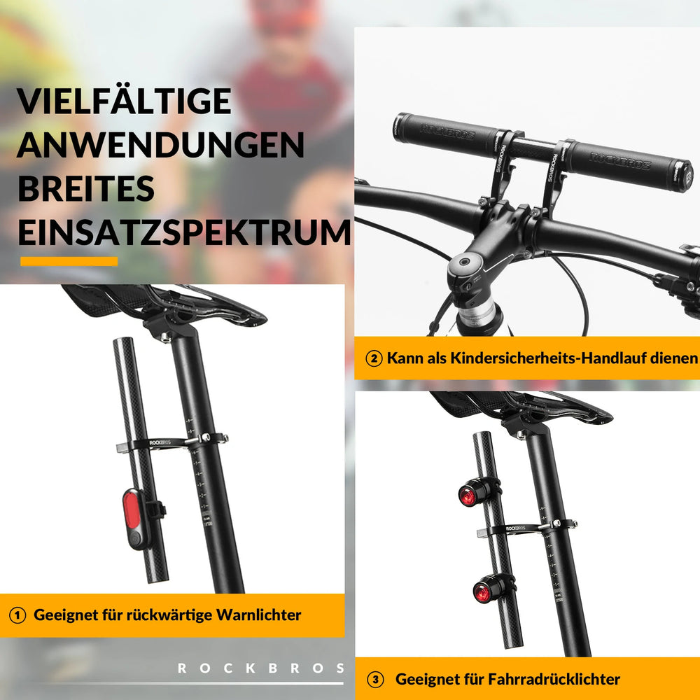 An der 25 cm langen Lenkerverlängerung können Handyhalterungen, Fahrradlichter, Fahrradklingeln, Fahrradkomputer und andere Gegenstände angebracht werden.
