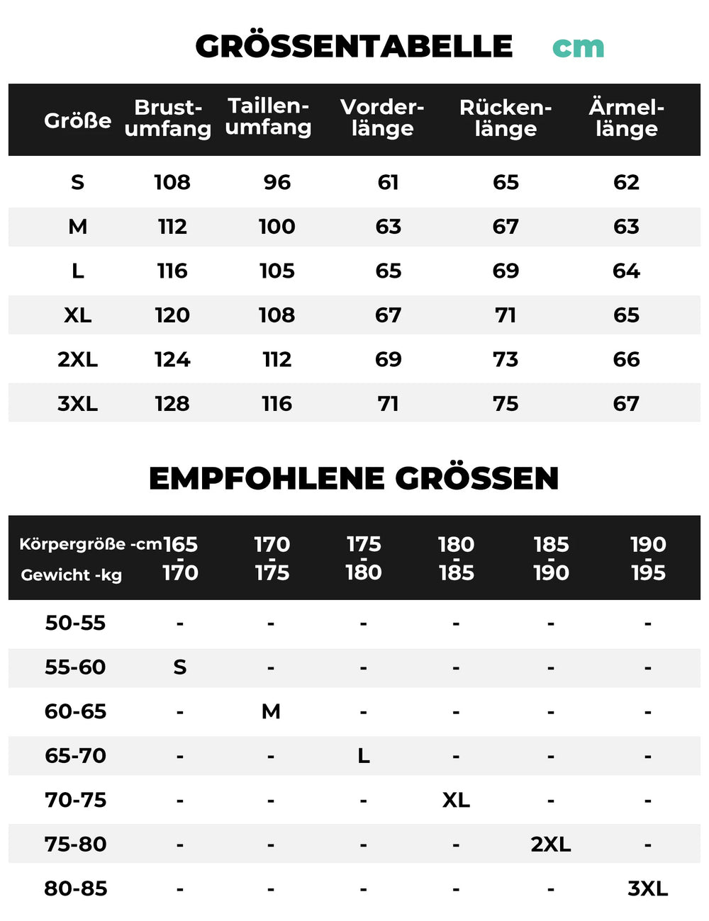 Inklusive präziser Größentabelle (S-3XL) mit allen relevanten Maßen (Brust, Taille, Längen, Ärmel) und einer empfohlenen Größenmatrix basierend auf Körpergröße und Gewicht. So finden Sie garantiert die perfekte, sportliche Passform.
