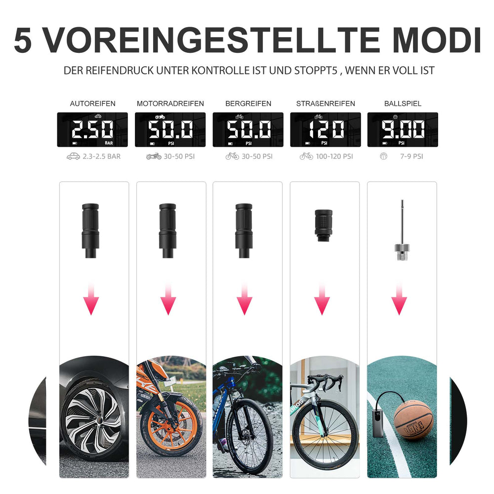 - Schnell aufblasbare Pumpe: tragbare elektrische Pumpe mit einem Luftdruck von bis zu 150PSI/10,3Bar. 2-3 Minuten, um einen Fahrradreifen vollständig aufzupumpen. Inklusive amerikanischer Düse, französischer Düse und kugelförmiger Nadel.