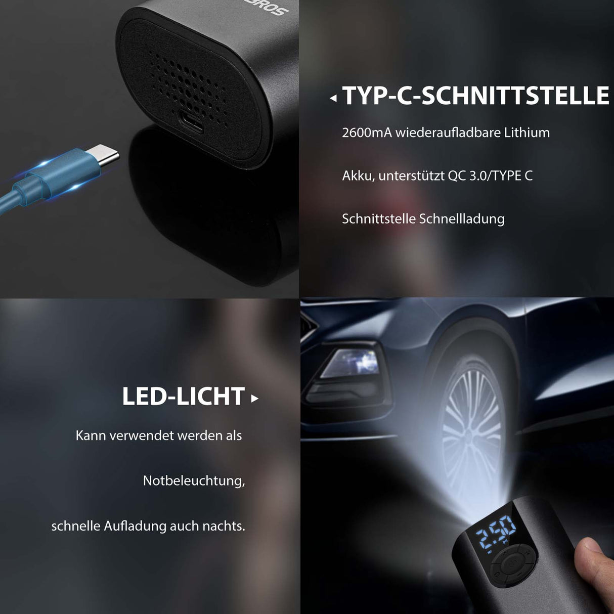 Zwei 2600mAh*2-Akkus sorgen dafür, dass die A10 für die meisten Aufpumparbeiten geeignet ist. Mit 3.0 QC Typ-C-Anschluss, dauert es nur 2 Stunden, um die elektrische Reifenpumpe vollständig aufzuladen.